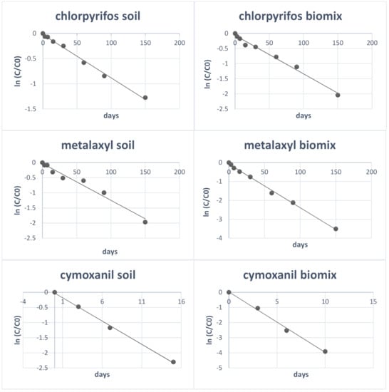 The degradation trends of the three pesticides in soil and biomix are reported in Figure 2, while Table 4 reports the degradation parameters derived by applying the first order kinetics to the degradation data.