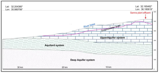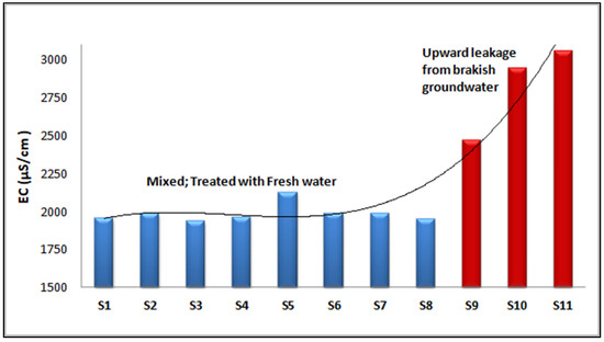 Based on the above results, we concluded that the quality of treated water is improved due to the enhanced performance and efficiency of As Samra Treatment Plant. Also, due to natural purification along the river: the analyses of BOD5, COD, and DO clearly demonstrated that. Further, this environmental recovery directly boosted agriculture in terms of production and quality. However, it was clear that Electrical Conductivity (EC) is increased in the downstream area. To further assess the impact of treated wastewater on agriculture, we considered EC as one of the indicators, and therefore we examined EC values along the study area. The analysis shows that EC values measured at the 11 sampling points are in the range of approximately 1900–3100 µS/cm. Sampling points 1 through 8 shows EC ranging from 1938 to 2122 with an average of 1987 µS/cm. On the other hand, samples collected at points 9–11 showed EC ranging from 2468 to 3060 with an average of 2825 µS/cm. The collected data suggests that elevated EC toward the downstream area is not related to the surface water or wastewater treatment process: it is, however, due to upward leakage of brackish groundwater from the sandstone (Kurnub) aquifer (Figure 8).