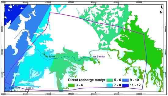 - Artificial recharge: this type takes place directly at the point of activities. It includes resources such as irrigation return flow, physical losses, and leakage from water supply networks and effluent of waste water treatment []. However [], groundwater recharge is dominant in the upper Zarqa River (AS Samra plant area). This approach was based on water budget and change of soil storage which is controlled by land use and soil water holding capacity. The resulted natural recharge to the groundwater found to be in the range of 3 to 12 mm/year, which is largely controlled by rainfall distribution and topographic slope. The spatial distribution of natural recharge is shown in Figure 3.