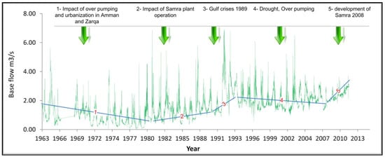 Figure 4 shows the long term record of the Zarqa River base flow which indicates the surface–ground water interaction. The discharge into the Zarqa River is resulted from a complicated drainage system governed by topographic relief. According to this record, overpumping and climatic variability reduced the river base flow in the 1970s, which was recovered later on due to the construction of As Samra plant and recovering surface and groundwater resources in the area.