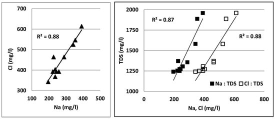 Correlation between Na and Cl (left) and Na and Cl with TDS (right).