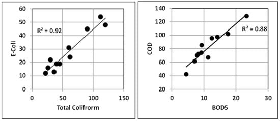 On the other hand, the analysis shows that there is strong dependency between Total Coliform and E. Coli. R2 is computed at 0.92 (Figure 6), which is a strong indication of the interdependency of these two variables. Consequently, strong dependency between BOD5 and COD is clear. As BOD5 and COD are commonly dependent, and the same applied for Total Coliform and E. Coli, the strong correlation among them indicates reliable data and accurate analysis.