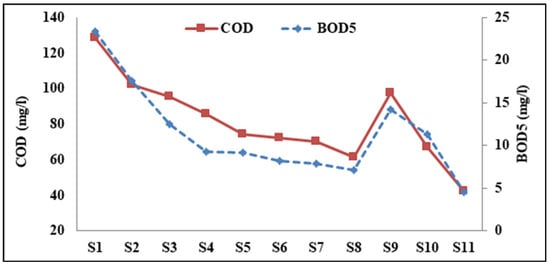 BOD5 and COD values measured at 11 sampling points in the study area.