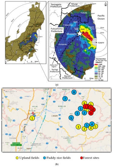 Soil samples were collected from eight arable fields on 5 and 6 August 2013—referred to as Arable 1 to Arable 8—eight paddy rice fields on 8 and 9 December 2013—referred to as Paddy 1 to Paddy 8—and five coniferous forest sites on 31 October, 27 and 28 November 2012—referred to as Forest 1 to Forest 5—in Nihonmatsu City, Fukushima Prefecture, Japan, which is located 50 km away from the nuclear power plant (Figure 1) (Table 1).