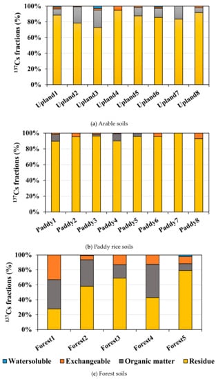 The results of sequential extraction showed that, in arable soils, both water-soluble and exchangeable fractions ranged from 1%–5% of the total 137Cs extracted, while the organic matter-bound fraction ranged from 6%–20% for all sites (Figure 2a).