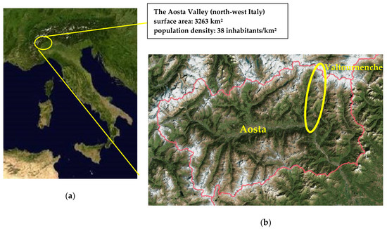 The Aosta Valley in north-west Italy (a), the smallest, least populous and least densely populated region in Italy; the yellow circle highlights the Valtournenche valley where the study was carried out (b) (Figure 1a courtesy of NASA/JPL-Caltech. Figure 1b is taken from the regional map website: http://geonavsct.partout.it/pub/GeoCartoSCT/index.html).