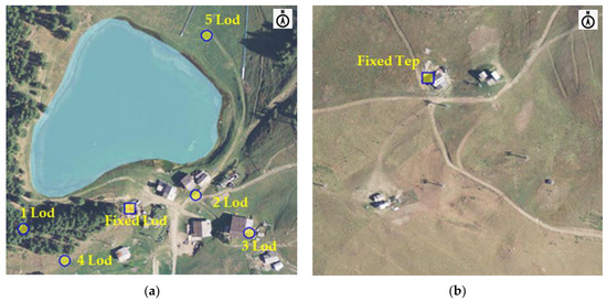 Picnic area at Lake Lod, with (a) the positions and the names given to the acoustic measurement points and (b) the Teppa location in the upper part of the ski area. As in Figure 4, the squares stand for fixed monitoring points and circles for the surrounding short-term monitoring points. Source: http://geonavsct.partout.it/pub/GeoCartoSCT/index.html.
