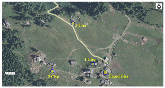 The Cheneil area extends from the small village of Cheneil in the plain at the foot of a valley, which is characterized by woodlands and pastures, to the top of the mountains above. The measurements were carried out around the village houses (Figure 6).