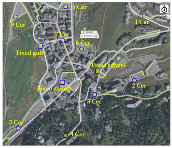 Breuil-Cervinia is one of the highest ski resorts in Europe, which means low temperatures and consistent snow falls in winter [14]. Skiing is practised nearly all year-round, because of the presence of a glacier at the top of the resort. Six fixed monitoring points were set up in Breuil-Cervinia: 3 of these points were located in the urban center and 3 in the ski area (at Plan Maison, at Cime Bianche and at Plateau Rosà). As for the other resorts, 3-4 stations were set up in the Breuil-Cervinia village (Figure 7) for short-term measurements, the characteristics of which are shown in Table 5.