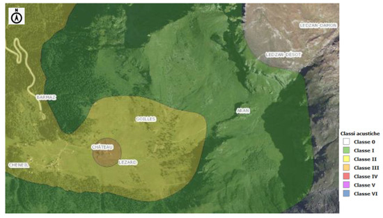 There are no ski lifts in the Cheneil valley and only ski mountaineering and snow racket trekking are practiced in winter. Since this type of attendance does not require a seasonal acoustic classification (Figure 11), the entire area was included in the two most protective acoustic classes throughout the year. Hikers and mountain bikers frequent the valley in summer, while the pastures are used for grazing cows and sheep. In these sites, which are generally far from urbanized contexts where the main infrastructures and human activities are most prevalent, the environment has an unspoiled acoustic climate.