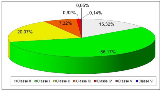This means that most of the Aosta Valley territory is part of class 1 (56%) or class 0 (15%), which is specifically required in regional regulations to preserve the naturalness of remote, high mountain areas that generally extend above 2500 m of altitude. Twenty percent of the remaining territory falls into class 2, while only 9% falls into the third to the sixth classes (Figure 12). Most of the Gran Paradiso National Park and the Mont Avic Regional Park territory and most of the main protected areas in the Aosta Valley region also fall into the first two acoustic classes (0 and 1).