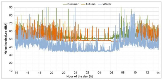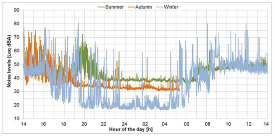 LAeq (dBA) detected in the acoustic measurement campaign divided by the period of the day and by the seasons.
