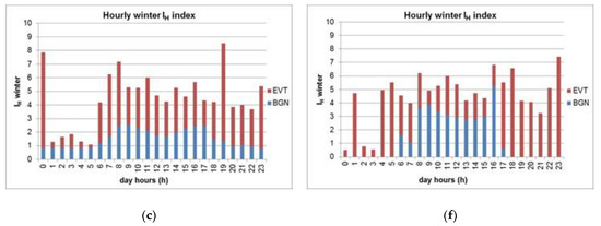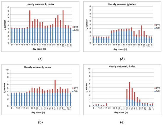 The “e” and “f” graphs in Figure 17 also suffer from a lack of the background noise (BGN) in the IH index in some parts. This occurred when background sound levels below 30 dBA were acquired, a situation in which the mathematical expression would have led to negative values of the index. Following a comparison, and on the suggestion of the harmonica project developers, it was decided to set this factor to zero, thereby avoiding negative values while preserving the original philosophy of the index. In these cases, only the part due to the events (EVT) is represented on the graph.