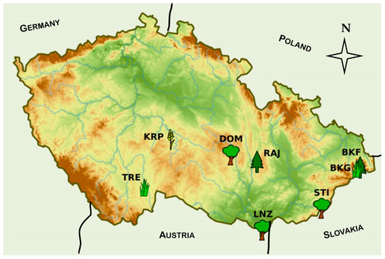 CzechGlobe sites (CzeCOS network). BKF: Bily Kriz spruce forest, BKG: Bily Kriz grassland, STI: Stitna beech forest, RAJ: Rajec Jestrebi spruce forest, LNZ: Lanzhot floodplain forest, DOM: Domaninek poplar plantation, KRP: Kresin agroecosystem, and TRE: Trebon wetland.