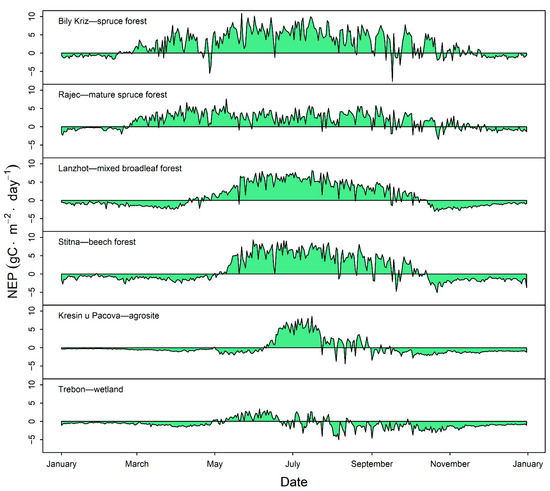 Comparison of annual course of net ecosystem production (NEP) for various ecosystems in the Czech Republic during the year 2018 (unpublished data Šigut et al.).