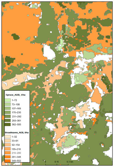 Map of forest aboveground biomass developed by the plot-level method from a fusion of hyperspectral and LiDAR data (Beskydy Mountains, Czech Republic). Adapted from (Brovkina et al., 2016).