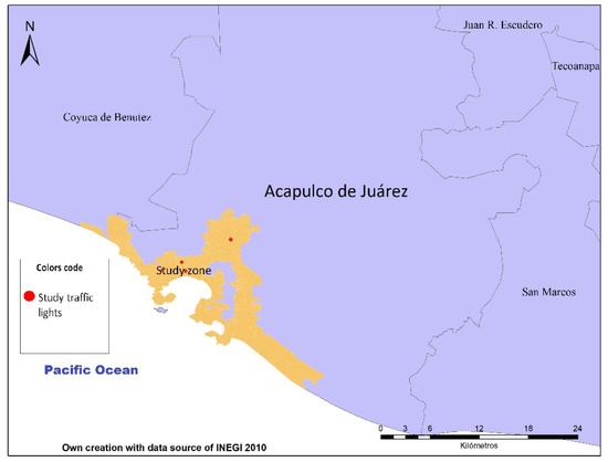 The study area is located in the metropolitan area of the city and the port of Acapulco, Guerrero, Mexico. Specifically, the study area comprises four specific points (Figure 1, in brown), which are located at the busiest traffic intersections. This study area allows one to assess general information on the municipality and its population, as well as other factors.