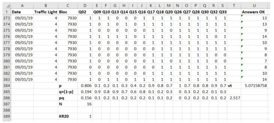 Next, we decided to use KR-20 while employing only questions with dichotomous answers and default applications, such as SPSS Cronbach’s alpha. The data were adjusted to 0 in Excel, and the negative response was migrated to a positive one. The formula for KR-20 is: