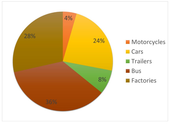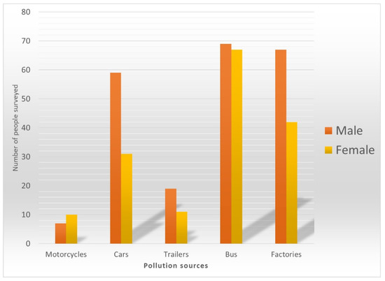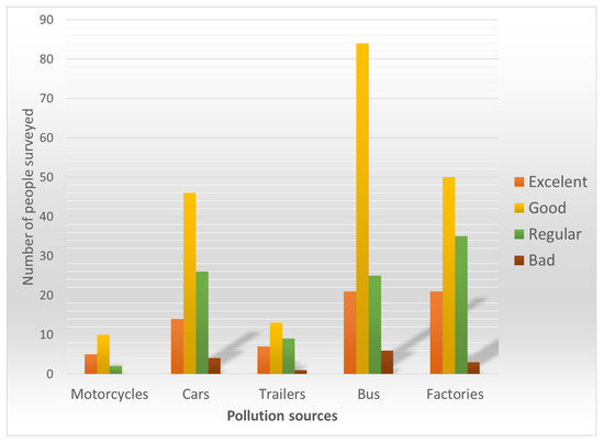 As surveys were applied near places with very high rates of traffic, one of the questions was aimed at determining the respondents’ perceptions of the causes of pollution, primarily regarding motor vehicles. Europe, specifically Portugal, has come a long way in the classification or nomenclature of air pollution, where there are 11 different categories, including commercial and residential combustion, industrial combustion, production processes, transport, and mobile sources, including waste disposal [26]. In this study, we focus on transport and mobile sources because many of these sources of air pollution are not present in the study area.