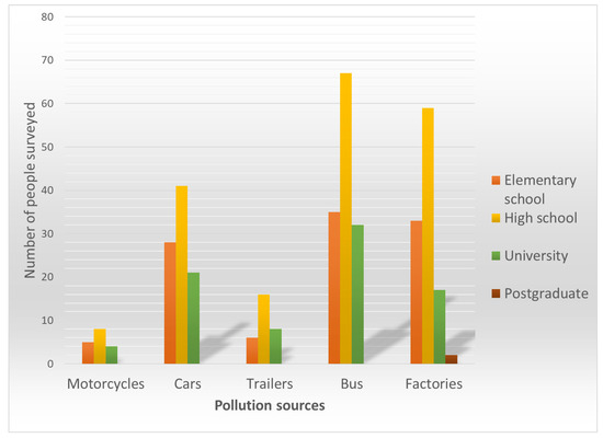 As shown in Figure 9, the level of education undoubtedly influences the perception of what pollutes. Those who have a bachelor’s degree believe that trucks pollute more, while factories were perceived to pollute the least by those with middle and basic levels of education. However, the respondents with a postgraduate level of education perceived factories to contribute the greatest to air pollution, as no one in this educational category chose another option.
