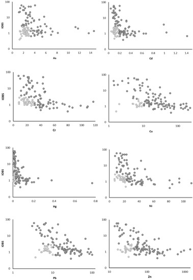 When we considered all samples, the correlations between the metal concentrations and IOBS index were highly significant for all metals except As (Figure 1, Table 2). The correlations were greatly improved (the correlation between as and IOBS became highly significant) when we excluded the entries showing both a biological effect (IOBS < 3) and a concentration of metal < 2-fold the estimated background concentration (Figure 1, Table 2).