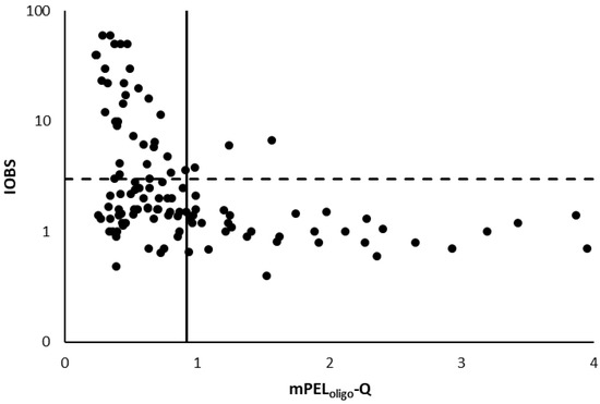Relationships between the metal contamination mPELoligo-Q index and the Oligochaete index of sediment bioindication (IOBS). Dotted horizontal line is set at the threshold for good biological quality (IOBS = 3). The vertical line is set at the mPEL-Qoligo = 0.92.