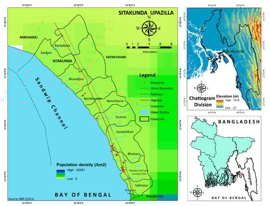 Shipbreaking industries are mainly concentrated in this upazila because of its location near the Bay of Bengal. Sitakunda is located in between 22°22′ and 22°42′ north latitudes and in between 91°34′ and 91°48′ east longitudes, with an area of 483.97 km2. It is surrounded by Mirsharai and Fatikchhari upazilas on the north, Pahartali thana on the south, Fatikchhari and Hathazari upazilas and Panchlaish thana on the east and Sandwip upazila and Sandwip channel on the west []. The convenient geographical position and the oblique shape of the Bay of Bengal have facilitated the establishment and flourishing of shipbreaking activities in Sitakunda. Salimpur, Bhatiary, Kumira and Bar Aoulia Unions of Sitakunda upazila accompanied by 7 km of coastline mainly accounted for the shipbreaking industry. This area is now centered on shipbreaking scrap business as well as steel industries (Figure 1).