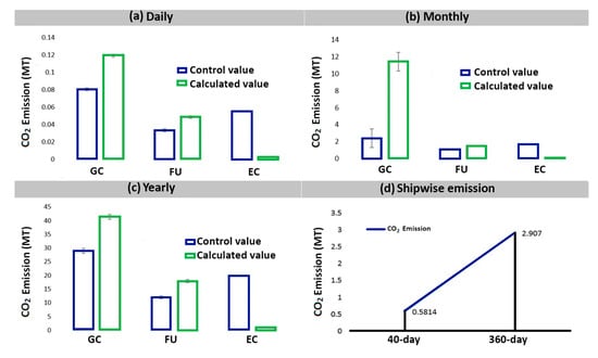 Variations of (a) daily, (b) monthly and (c) yearly CO2 emissions from gas cutters, diesel and electricity consumption in shipbreaking yards (n = 15) compared to the control value (). Bars indicate standard deviation (SD). (d) Ship-wise (n = 9) CO2 emission in a particular time period. Here, GC = gas cutter, FU = fuel use and EC = electricity consumption.