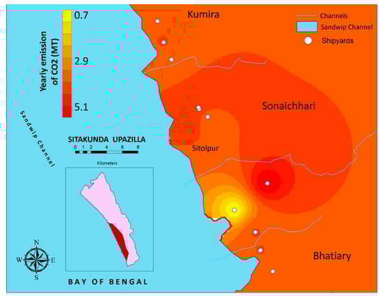 Figure 3 represents the spatial distribution of yearly CO2 emission (MT) throughout the shipyards. It showed the overall carbon emission scenario from different shipyards. ArcGIS ordinary inverse distance weighted interpolation was done to visualize the spatial distribution of yearly emission. It was observed that the eastern part of the region has more emission (>5.1 MT per year) from shipyards, especially in Sonaichari. However, some shipyards in Sitolpur showed lower emission (~1 MT per year). This area is adjacent to the Bay of Bengal. Shipyards from Bhatiyari and Kumira had average emissions compared to other areas in Sitakunda.