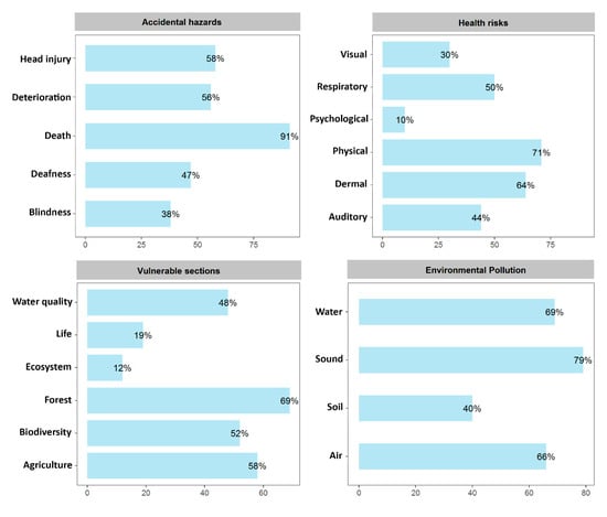 The study categorized the environmental hazards into two parts, i.e., environmental pollution and negative consequences on the environment during shipbreaking activities. Figure 4 shows that the majority of respondents (79%) pointed out sound pollution as the main pollution they faced. A significant portion of respondents were concerned about water and air pollution. However, they were not very concerned about soil pollution, though a large portion of heavy metal was discharged into the soil near shipyards. Respondents also expressed their opinion about the environmental degradation due to the shipbreaking activities. The majority of the respondents (69%) perceived deforestation as the major environmental consequence. However, most of them were not concerned about ecosystem imbalance. On the other hand, almost equal portions of respondents expressed their opinion on agricultural disruption (58%) and biodiversity loss (52%) (Figure 4).