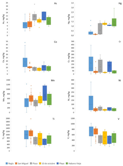 27]; this percentage was also 58% for Cd, 33% for Co, 31% for Cr, 87% for Cu, 65% for Mn, 58% for Ni, 70% for Pb, 71% for Zn, and 84% for Hg. Furthermore, the average V concentration for world’s soils was exceeded by all samples, while the average Ti concentration for world’s soils was never exceeded. However, Ti and V pseudo-total concentrations were highly correlated.