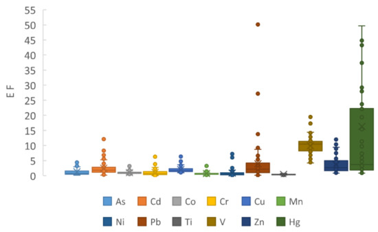 36]. There was significant enrichment in V, while for Pb, Zn, and Hg the median values denote moderate enrichment, but outliers reached significant enrichment in Zn and extremely high enrichment in Pb and Hg.