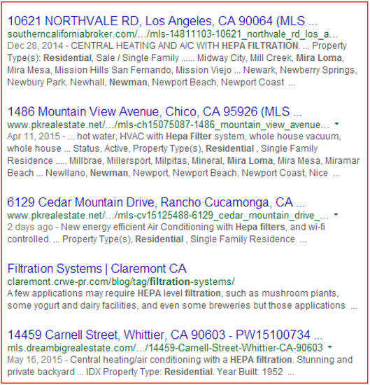 California Real estate advertisements highlighting HEPA filtration as an feature.