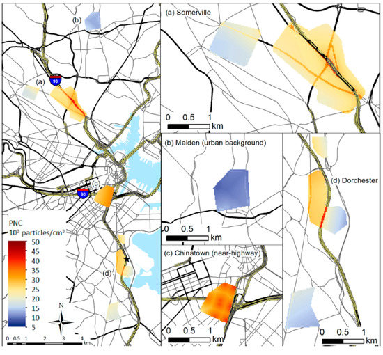 Ultrafine particle (UFP) level maps. The Community Assessment of Freeway Exposure and Health (CAFEH) study conducted mobile air pollution monitoring in three sets of paired neighborhoods, near the highway and >1 km from the highway (listed as (a–d) on the map). UFP were measured as particle number count using a condensation particle counter. The data from the mobile monitoring were used to develop land use regression (LUR) models of particle number count (or PNC, a measure of ultrafine particles) for each of the study areas. The LUR models had a resolution of 20 m and 1 h. The hourly estimates of PNC level were then averaged over a year to calculate the annual average values that are plotted in this figure.