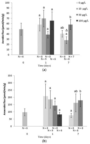 (a) Aerobic flux (μmol/min/g) and (b) anaerobic flux (μmol/min/g) in white muscle of juvenile roach during Cu exposure. Bars represent S.E. Different letters indicate significant differences for the same time point. Δ indicates significant differences for the same concentration among individual samples at T1 and T7.