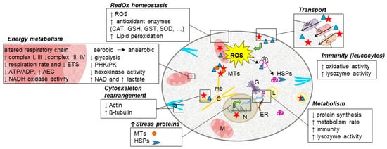 In the context of environmental risk assessment, stress response biomarkers can be categorized as (i) overexpression of stress proteins, i.e., metallothioneins and chaperones, (ii) redox homeostasis alteration, (iii) cytoskeleton rearrangement, i.e., toxic effects and resistance effects prompting differences in the cell structure, (iv) disruption of metabolic homeostasis, (v) free cellular energy as well as mitochondrial metabolism, and (vi) immunity modulation.