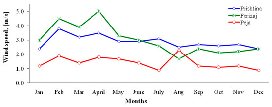 Figure 3 shows the average monthly measured wind speeds at different area locations in Kosovo [18,19].