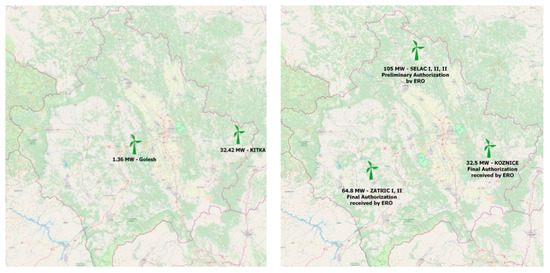 Installed (left) and planned (right) wind farm plant projects in Kosovo [4].