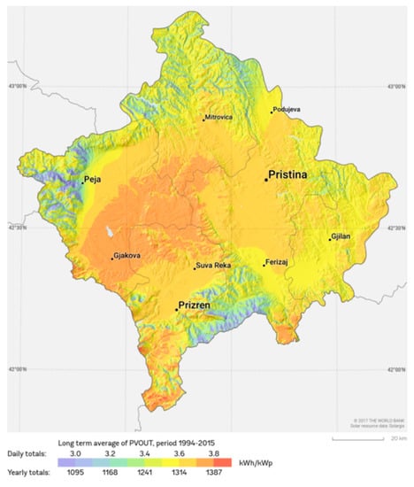 - Global Solar Atlas. Available online: https://globalsolaratlas.info/downloads/Kosovo (accessed on 19 October 2018).