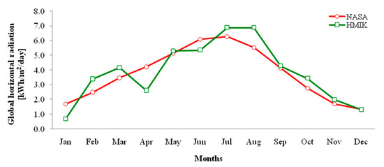 A comparison of global horizontal radiation data taken from the literature [17,20] are analyzed and presented in Figure 6.