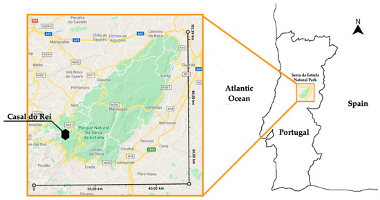 The area selected for this study is located on a mountain slope in front of the village of Cabeça and the village of Casal do Rei. Both locations belong to the Union of Parishes of Vide and Cabeça in the municipality of Seia and the district of Guarda. Figure 1 shows the location of the target area and its regional and national context.