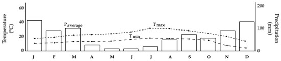 Air temperature and precipitation based on the information available in Table 1 for Casal do Rei using the values modeled with METEOBLUE (https://www.meteoblue.com). In the figure, the maximum temperature (Tmax), minimum temperature (Tmin), and precipitation are represented.