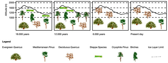 Evolution of pine forests and other woody formations since the last glacial maximum in the different bands of Serra da Estrela (adapted from [55]).