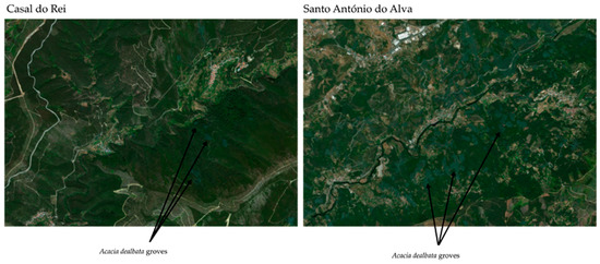 The Acacia dealbata groves considered in this study, as already mentioned, are visible from the road that connects Casal do Rei to Cabeça, located on the opposite slope, on the other side of the valley, where the Loriga stream runs, as can be seen in Figure 2.