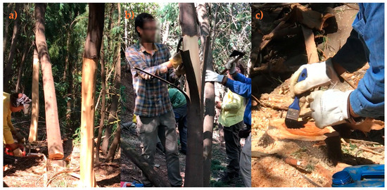 Cutting work and application of control techniques for invasive species. (a) Cutting; (b) peeling the acacias; and (c) application of glyphosate.
