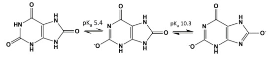 Chemical structure of uric acid and urate conjugate bases.
