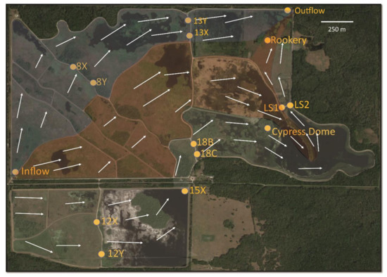 Effluent from wastewater treatment facilities contains high concentrations of nitrogen (N) and phosphorus (P). When water from these facilities flows directly into rivers and streams, the presence of N and P can result in the rapid growth of algae, eutrophication, and the death of animal life due to depleted oxygen in the water. The treatment of wastewater with biotic and abiotic processes in dedicated wetlands is a frequently employed water polishing method [1]. Heterotrophic microbes [2], emergent and submerged aquatic vegetation (SAV) [3], the accretion of organic matter [4] redox [5], precipitation, and sorption [6], each help to remove nutrients, including nitrogen and phosphorus. The Orlando Easterly Wetlands (OEW) is a treatment wetland located in east Orange County, Florida, in the United States. Prior to wetland construction, the area was a cattle pasture. It began receiving the effluent from a wastewater treatment plant (WWTP) in 1987 [7]. The OEW was created for the secondary water treatment of effluent from a nearby municipal WWTP, which serves approximately 400,000 residents of central Florida. The site has been successful in its intended purpose of diminishing nutrients from the water; the total nitrogen concentration decreases from 2.31 mg/L (influent) to 1.0 mg/L (effluent). The phosphorous concentration decreases from 0.13 mg/L (influent) to 0.03 mg/L (effluent). The OEW has provided a platform for several water treatment studies including hydraulic analysis [8], prescribed burns [9] and analytical chemistry educational research [10].