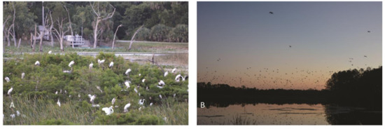 (A) Photograph of a rookery OEW site with the outflow canal control structure in the back. (B) Birds exit cypress dome at sunrise during bird count in December 2017.