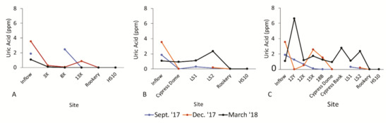 The U.S. state of Florida, where the OEW is located, has a large transient migratory bird population with many species roosting during the winter. Roosting species have been shown to contribute to eutrophication of waters below their nest. One study within the closed ecosystem of the Maji Agricultural Reservoir in Wonju, Gangwond-do, South Korea found that cormorants can contribute heavily to the eutrophication of the waters below their roost [14]. In more open waters, such as Lake Balaton in Hungary, bird droppings were still considered to be a potential source of eutrophication, even from only a few hundred nests [15]. For the research reported herein, the quantification of ammonia and uric acid at the inflow was used to determine the anthropogenic contribution of uric acid concentration in the wastewater that had persisted through the WWTP. The stratified heterogeneous sampling of the water throughout the flow train of the park allowed the quantification of ammonia and uric acid added due to animal (non-anthropogenic) sources.
