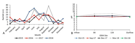 Contextual data from the OEW. (A) Monthly rainfall for the OEW during the years preceding and the year following the sampling dates. (B) Measured pH at the inflow and outfall canal from the sampling dates reported herein, as well as a date two years preceding and a date following, showing a largely invariant pH. The site locations refer to those labeled on the map in Figure 2.